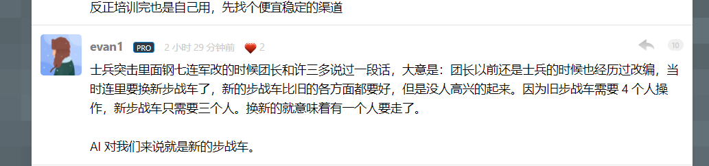 摘抄 2026 年 3 月 27 日 1 分钟阅读 AI 对我们来说就是新的步战车 摘抄 士兵突击里面钢七连军改的时候团长和许三多说过一段话,大意是:团长以前还是士兵的时候也经历过改编,当时连里要换新步战车了,新的步战车比旧的各方面都要好,但是没人高兴的起来。因为旧步战车需要 4 个人操作,新步战车只需要三个人。换新的就意味着有一个人要走了。 AI 对我们来说就是新的步战车。 部门在搞 AI 提效培训会,不知道为什么我很反感 - V2EX 继续阅读 下一篇 《听见涛声》《侧耳倾听》